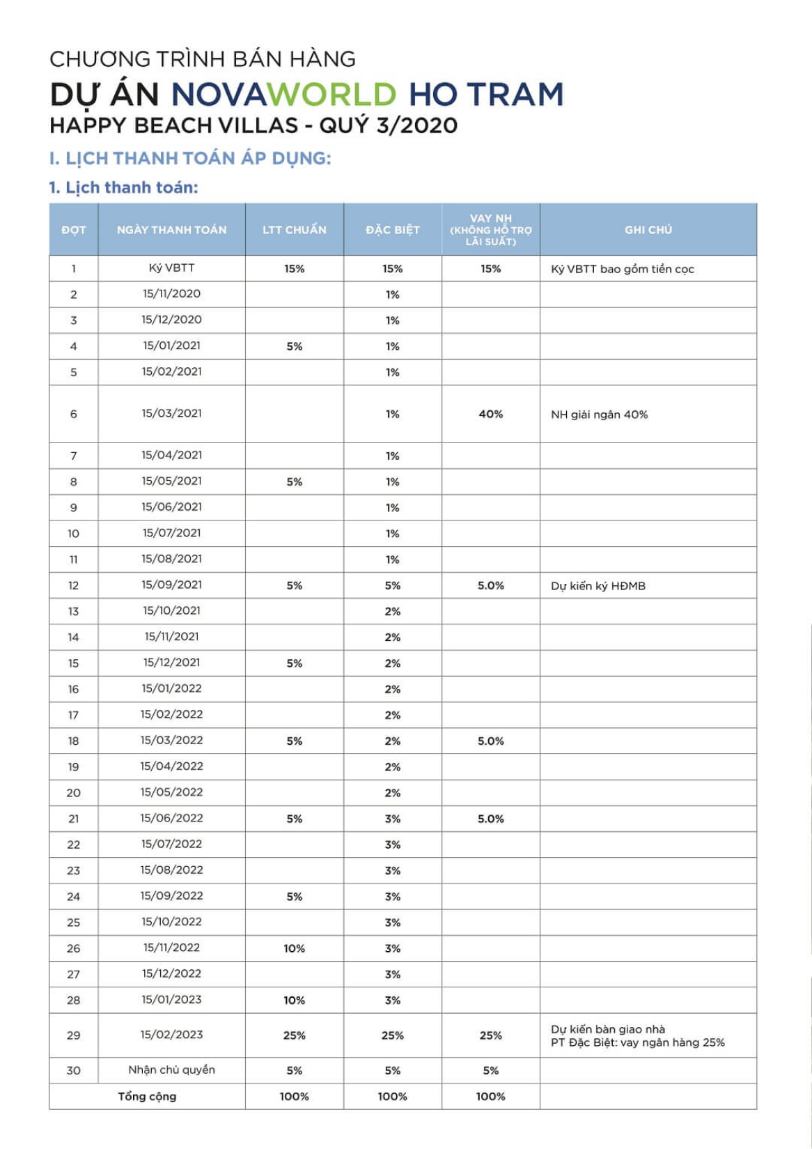 Novaworld Hồ Tràm có nhiều phương thức thanh toán để khách hàng lựa chọn. Sau đây là phương thức đặc biệt, ngoài ra còn có các phương thức thanh toán nhanh, trả góp 1%/tháng hoặc vay ngân hàng Novaland hỗ trợ lãi suất và ân hạn gốc đến nhận nhà. Liên hệ để biết thêm thông tin 0898.888.666